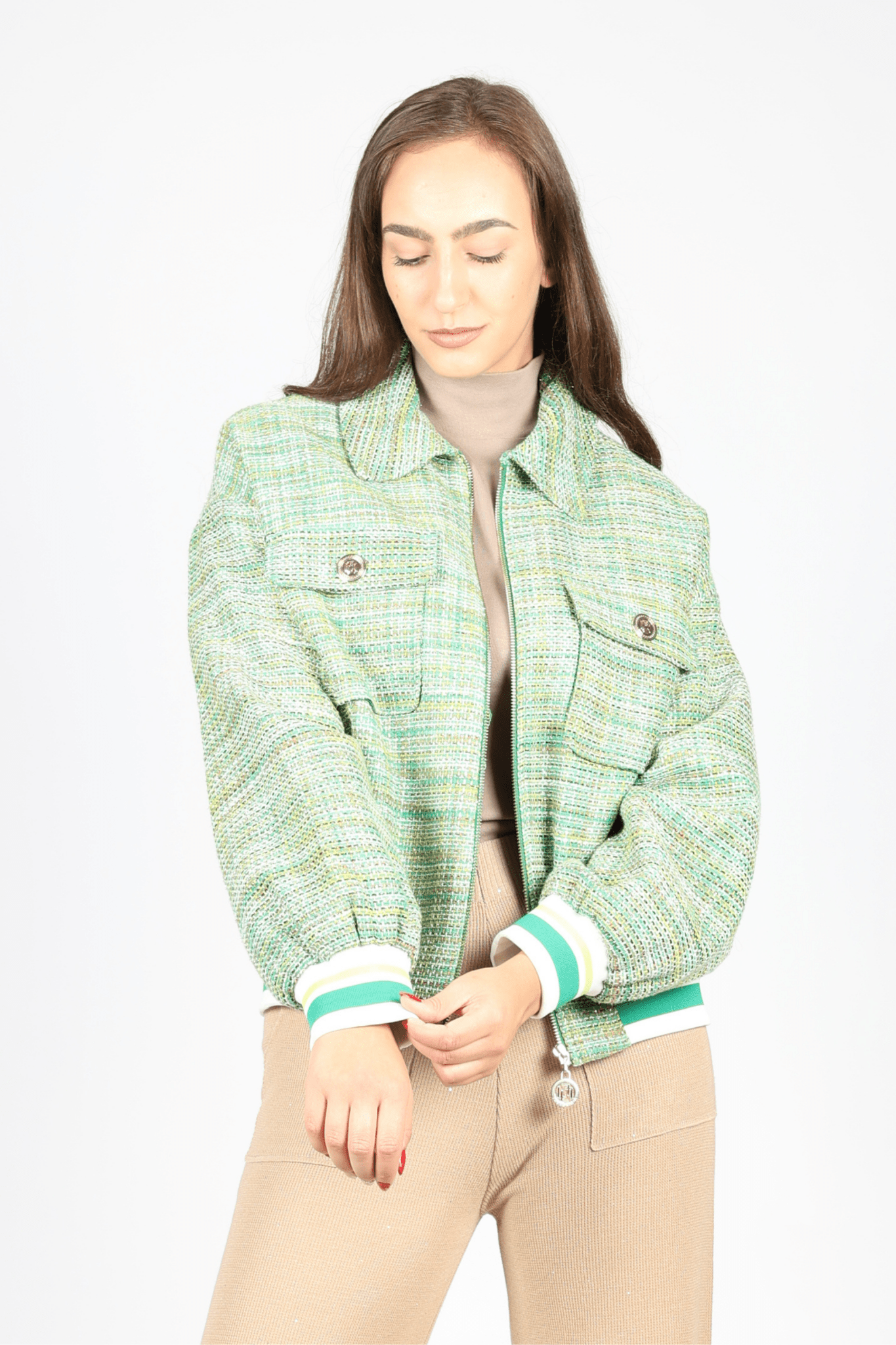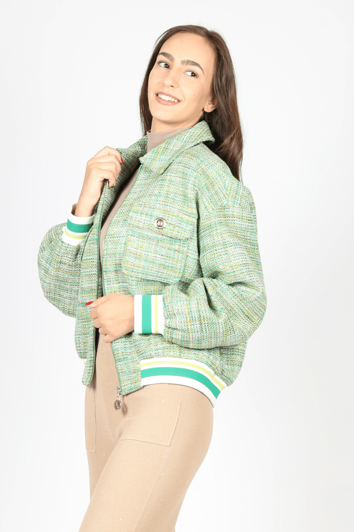 Представяме ви дамското бомбер яке в изключително елегантен зелен цвят, произведено от луксозната марка La Sagrada. Създадено с внимание към детайла, това яке е изработено от 98% памук и 2% лурекс, което го прави не само удобно, но и с лек блясък, добавяйки изтънченост на всеки аутфит.