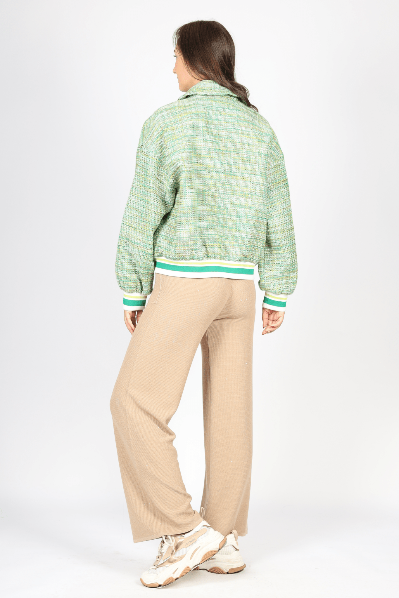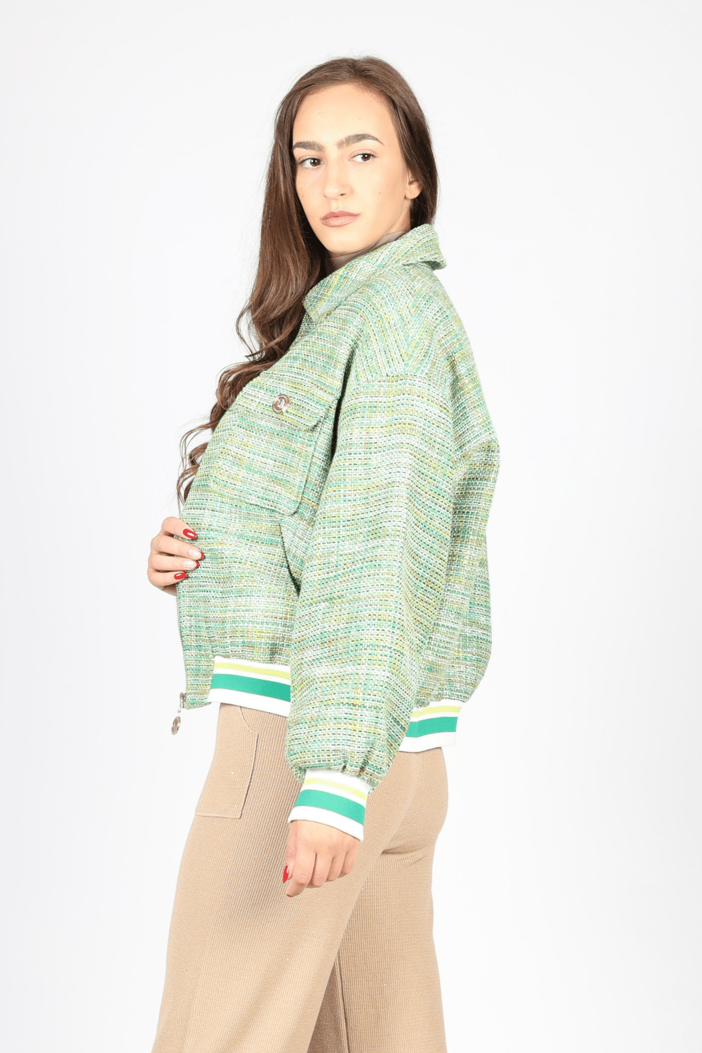 Уникалният зелен тон на якето е вдъхновен от природата, което го прави перфектен избор за пролетните и есенните сезони. Способността на памука да диша, комбинирана с лурекса, осигурява необходимия комфорт дори и в по-топло време.