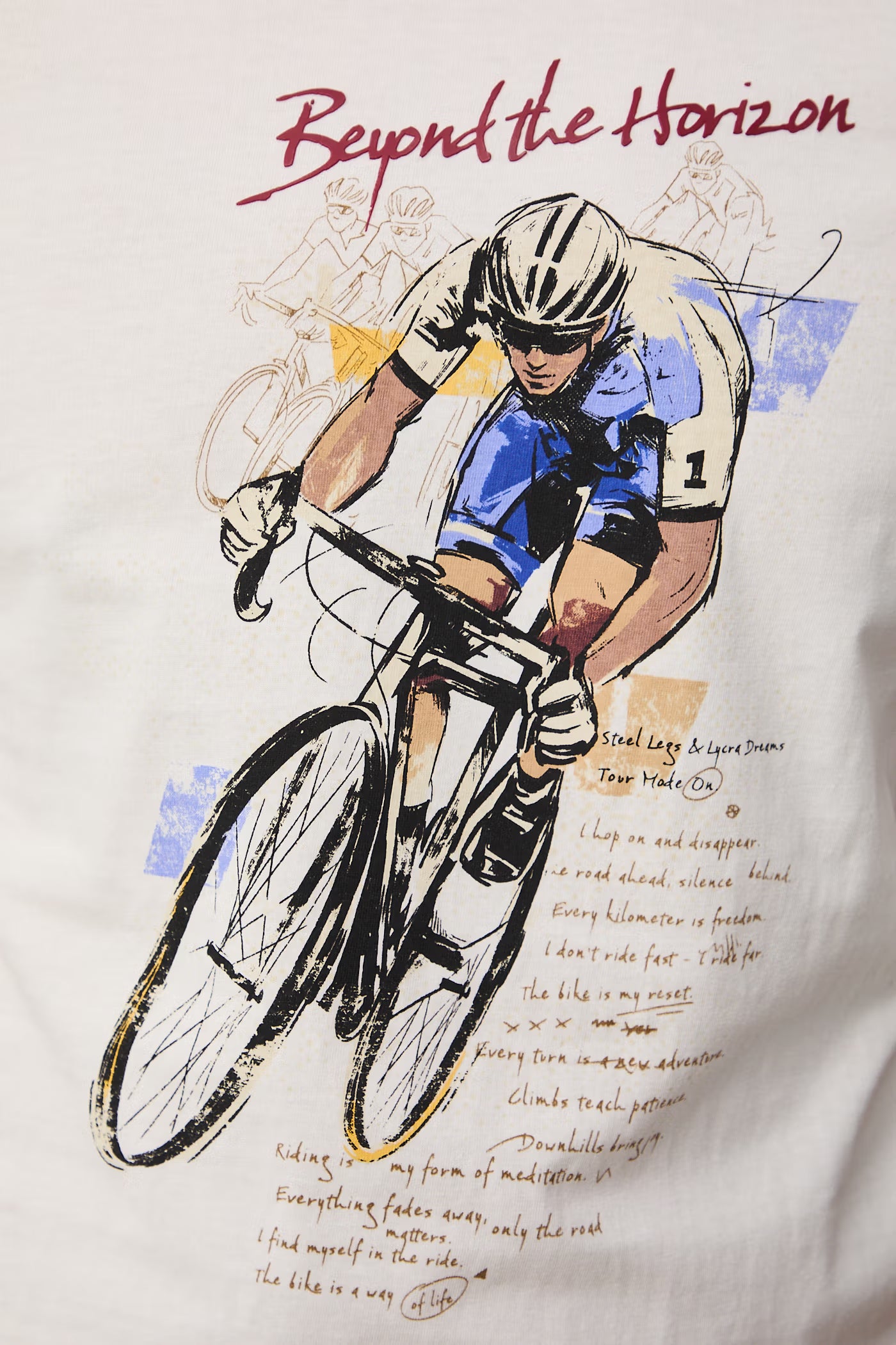 Дизайнът е централният акцент на продукта: абстрактен арт принт "Колоездач", изпълнен в модерен и изчистен стил, който добавя артистичен характер към иначе минималистичната визия. Принтът е със главен принт на предната част, което го прави подходящ както за градски аутфити, така и за поводи с по-неформален дрескод.